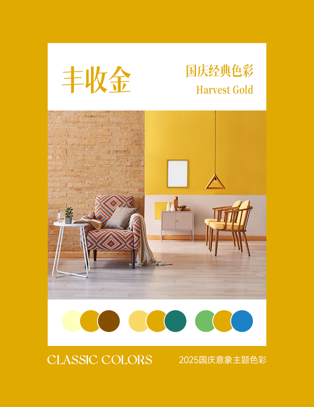 Harvest Gold丰收金源自秋收时节的麦浪和国庆庆典的金色元素,是一种温暖而华丽的色调。它代表着丰收、繁荣与希望,能够为家居空间带来温馨与光明。